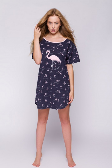 Koszula nocna w granatowym kolorze zdobiona najmodniejszym motywem sezonu - różowym flamingiem. Oto propozycja, która wygląda świetnie.
